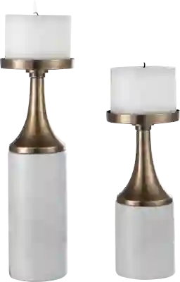 This set of two Catarine candleholders feature an antique brushed brass finish and an elegant white marble foot. Two 4x 3 off-white distressed candles included. Sizes S-5x10x5, L-5x13x5