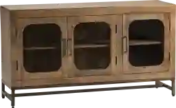 The Catchfly brown sideboard has a versatile look and function that makes this piece ideal as a sideboard in your living room or a buffet in your dining room. One storage shelf is tucked behind three cabinet doors. The doors each have a rectangular window with rounded corners to showcase what is hidden away. The medium-brown wood finish complements the gold wrought iron finish of the base and door handles. This piece has a beautiful transitional, rustic style.
