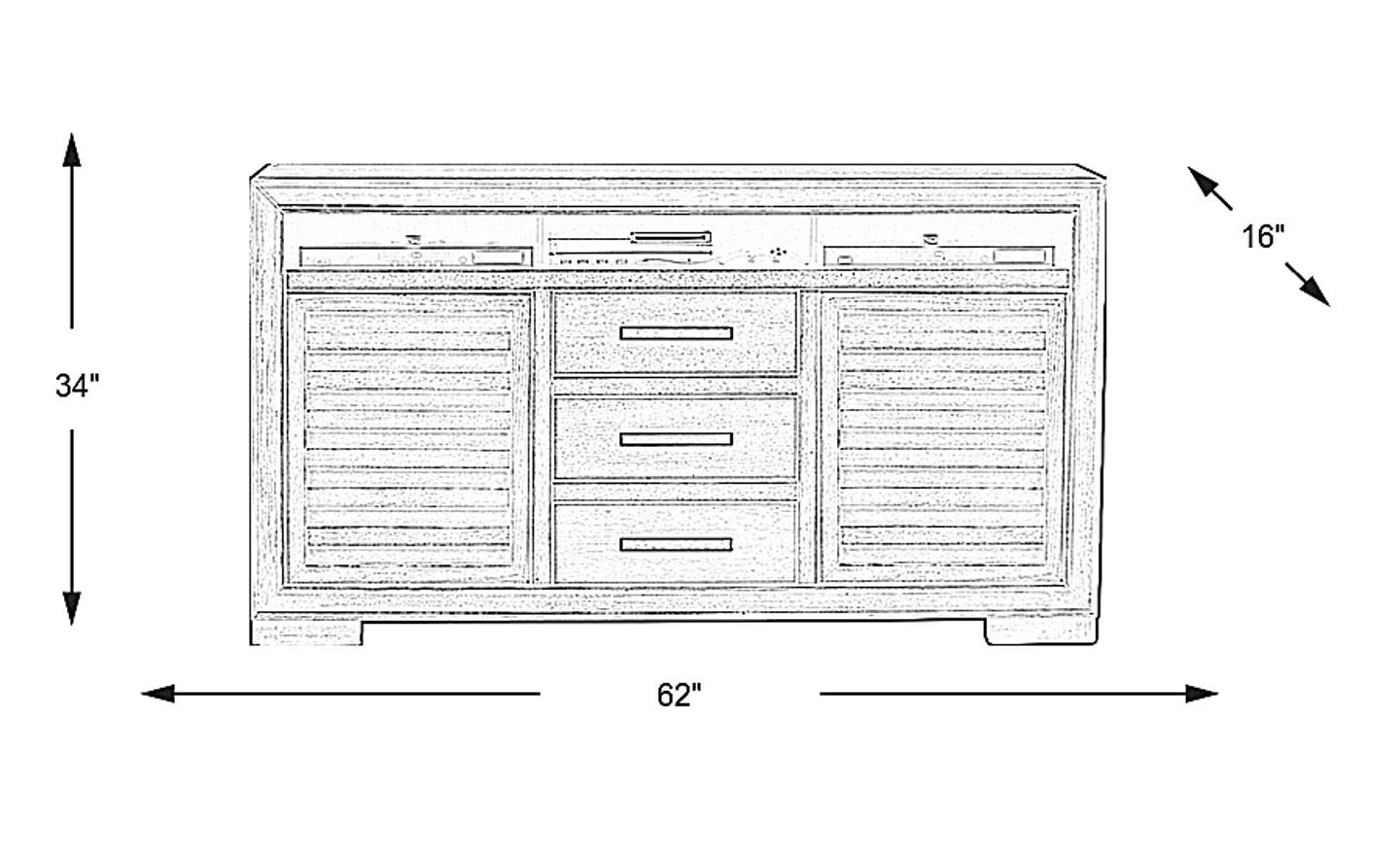 Transitional style and media storage combine on the Cates Ridge console. Finished in a rich tobacco finish, the 62 inch console is made with oak veneers. Three open cubbies offer space for electronics with pass through holes for electronics on the back panel. Triple drawers provide easy storage while a door on each side opens to reveal an adjustable shelf for keeping additional items.