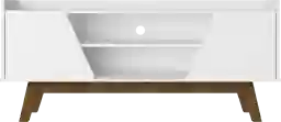 The tapered legs of this unit are crafted from solid pine wood. In furniture construction, solid wood legs provide superior structural integrity and weight distribution compared to composite materials. This ensures the stand remains stable and durable even when loaded with media equipment and decor.