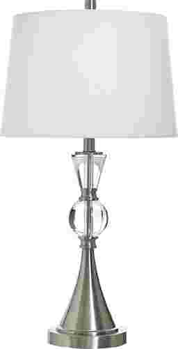 This lamp is designed with a "transitional" aesthetic, meaning it bridges the gap between traditional and modern styles. The classic flared pedestal base and empire shade nod to timeless silhouettes, while the crystal-clear acrylic accents and brushed nickel finish provide a fresh, contemporary lightness. It’s an ideal finishing touch for modern, coastal, or updated traditional interiors.