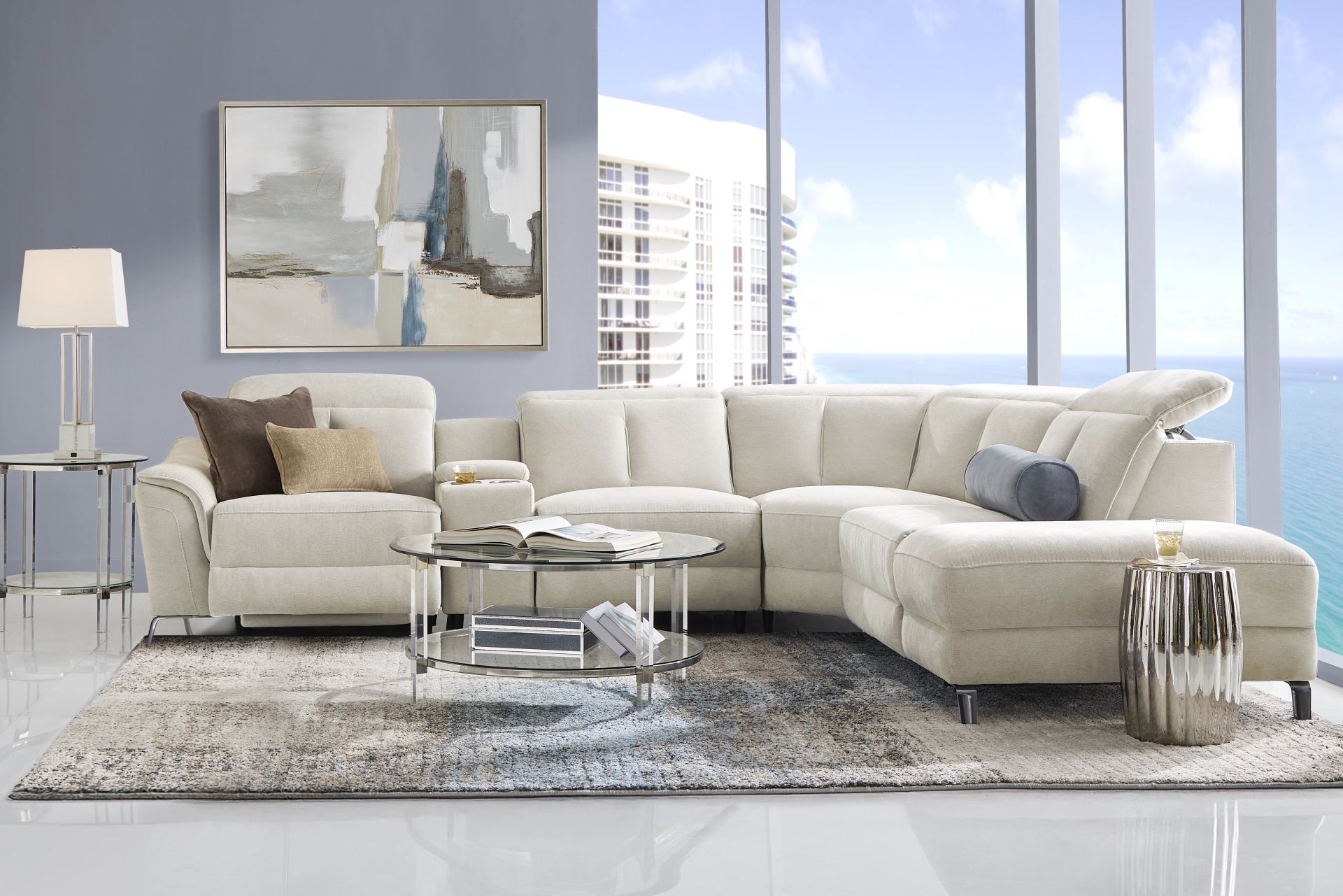 Steal the spotlight in a show-stopping performance of modern elegance with the Cavani collection's unapologetically luxurious look, feel and fabulousness. Beyond the dramatically flared arms and plush woven gray chenille, this contemporary sectional boasts a spacious and inviting seating arrangement that's perfect for lounging and entertaining. The console is equipped with convenient features like concealed storage, USB charging ports and a pair of stainless steel cupholders. Dual power recliners enhance your comfort with the simple press of a button, allowing two people to fully control their own headrest and footrest completely independent of one another. A bumper ottoman oriented on the right side of the piece rounds out the silhouette with a touch of sophistication while the chromium finish on the feet button the look with a modern edge. 100% Polyester