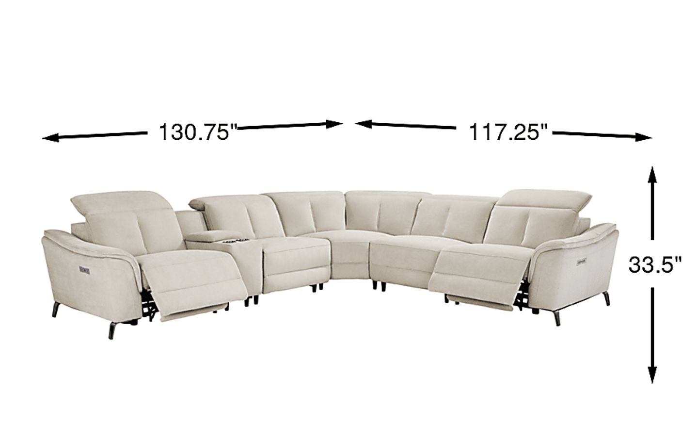 This is a large-scale piece designed to be the focal point of a spacious living area, with total dimensions of approximately 130.75"w x 117.25"d. When planning your room layout, we recommend leaving at least 18 to 24 inches of clearance for walkways. Because this is a reclining model, ensure there is sufficient space behind the backrests (typically 6–12 inches depending on the specific recline angle) and in front of the footrests to allow the dual power mechanisms to extend fully without obstruction.
