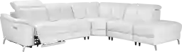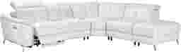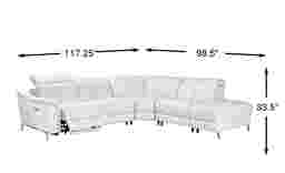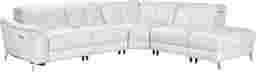 Steal the spotlight in a show-stopping performance of modern elegance with the Cavani collection's unapologetically luxurious look, feel and fabulousness. Beyond the dramatically flared arms and opulent white top grain leather where the body touches, this contemporary sectional boasts a spacious and inviting seating arrangement that's perfect for lounging and entertaining. Dual power recliners enhance your comfort with the simple press of a button, allowing two people to fully control their own headrest and footrest completely independent of one another. A USB port on each control panel provides convenient USB charging. The bumper ottoman oriented on the right side of the piece rounds out the silhouette with a touch of sophistication while the chromium finish on the feet button the look with a modern edge. Dual power LAF recliner, dual power armless recliner, corner wedge, armless chair, RAF bumper ottoman. Upholstery: top grain leather where the body touches with polyurethane sides and backs.