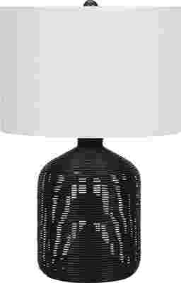 Add a casual chic ambiance to your living room, home office, or bedroom with the Cavernscape Black Lamp. This ginger jar base in a black rattan is complimented by an ivory fabric drum shade. With a beautiful textured finish base and dimmable lighting with the help of a simple rotary switch, this trendy table lamp will instantly add warmth to brighten a living room, bedroom and office. Partial assembly may be required.