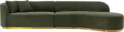 Green is a highly versatile "new neutral" in modern design. To enhance this sectional's bold color and golden mop base, our stylists recommend pairing it with earth tones like beige or warm wood accents to create a grounded, organic feel. For a more high-contrast modern look, you can incorporate navy blue or mustard yellow accent pillows, which complement the richness of the green upholstery without overwhelming the room’s balance.