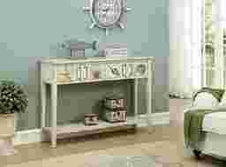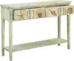 What a perfect place to showcase the finds of your early morning beach walk or framed photos of summer vacations! Finished in a creamy distressed sand-oatmeal with charmingly raised designs of the sea, this two door table features a large display area plus a handy lower shelf. CUSTOMER ASSEMBLY REQUIRED