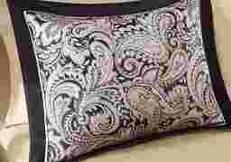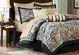 Offering a classic style with a contemporary touch, the Cayla queen comforter set makes a beautiful addition to any bedroom. The jacquard weave is inspired from an updated paisley motif, and features a beautiful combination of deep black, gold, and a hint of platinum. The comforter and shams offer beautiful details with a 2" flange and 1/2" flat piping in soft gold. The reverse of the comforter is a rich taupe color. This set includes 1 comforter, 2 standard shams, 1 bed skirt, 2 decorative pillows, 2 euro shams, 1 flat sheet, 1 fitted sheet, and 2 pillowcases. 100% polyester. Machine Wash Cold, gentle cycle, and separately. Do not bleach. Tumble Dry Low, remove promptly, do not iron. If there is no free movement in the washer or dryer, use large capacity commercial washer/dryer.