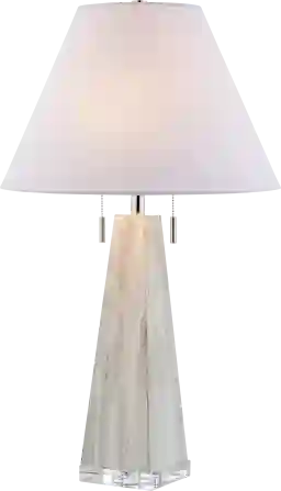 Elevate your interior decor with the modern Cayuga Club lamp. This lamp is a perfect blend of sophistication and style that will complement any room. With dual pull-chain switches for convenience, and a white tapper fabric shade for a soft glow, this lamp is a statement piece that is both practical and beautiful. The exquisite combination of white and gray marble and crystal base creates a sleek and elegant look that will instantly upgrade your space. Partial assembly may be required.
