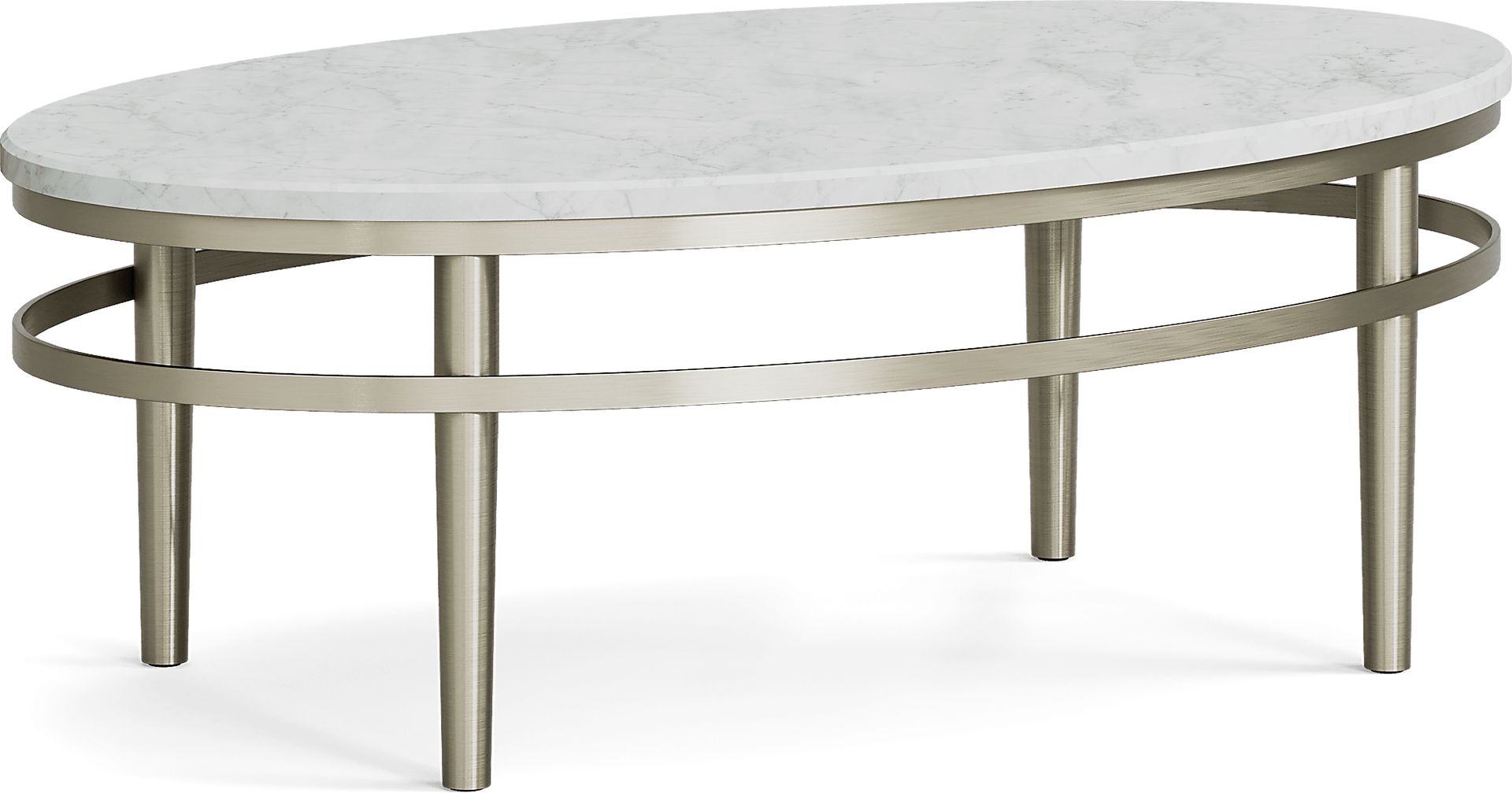 The sleek and stylish platinum design in the Cazelle cocktail table accentuates any room. A Carrara marble tabletop makes this contemporary piece the center of attention while the brushed stainless-steel base adds a modern touch of elegance and glamour.