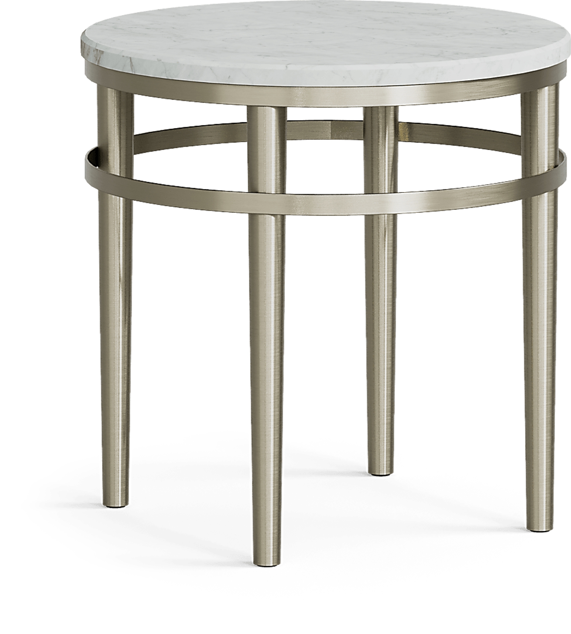 The sleek and stylish platinum design in the Cazelle end table accentuates any room. A Carrara marble tabletop makes this contemporary piece the center of attention while the brushed stainless-steel base adds a modern touch of elegance and glamour.