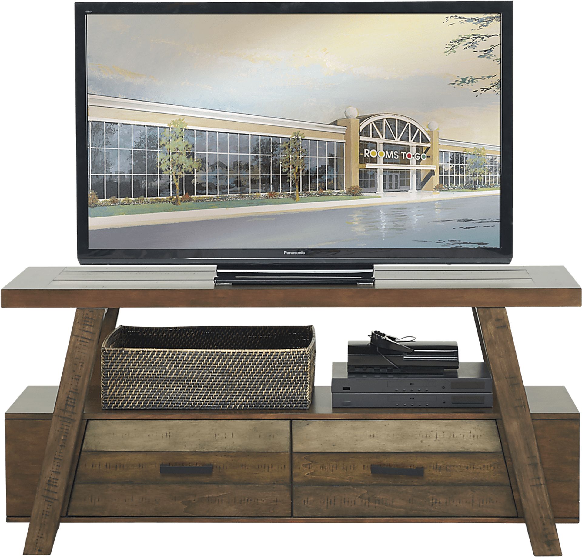 To help manage your living room clutter, this unit features two spacious multi-toned drawers and one large open shelf. The shelf is ideal for housing devices that require ventilation, such as gaming consoles or cable boxes, while the drawers provide a sleek, concealed space for remote controls, controllers, and media collections.