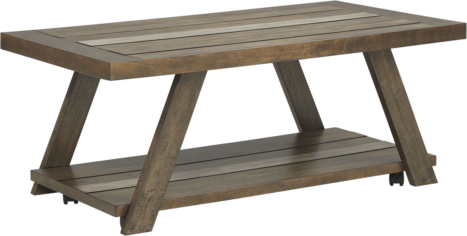 The Cedar Creek cocktail table offers a relaxed overtone and rustic elements. The plank style top and lower display shelf provide surface space for magazines, remotes and more. Crafted with birch veneers the table has a rich brown finish that will easily complement a variety of settings. Angled legs support the casual style while castors provide easy mobility when needed.
