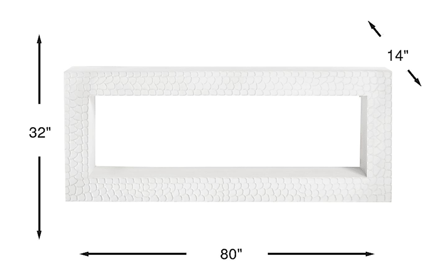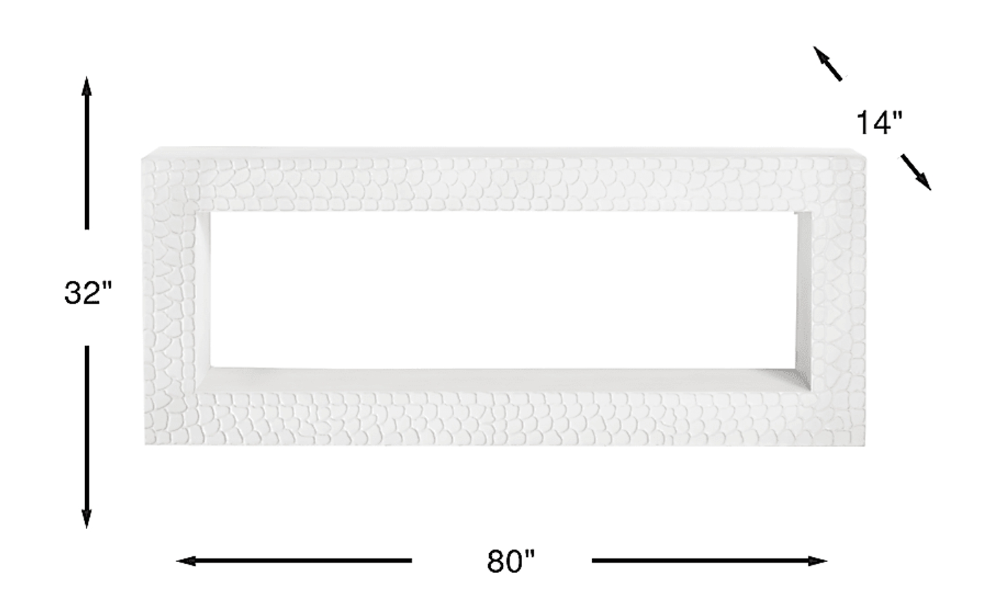 Where beauty meets function in every thoughtful detail, the Celestia console brings serene coastal charm and timeless elegance to your favorite living spaces. 80 inches in width, this piece showcases a hand-applied painted white finish that radiates a relaxed yet refined feel. The open-shelf design offers a perfect stage for curated decor, books and more everyday essentials, while the sculpted texture adds dimension and artisanal appeal.
