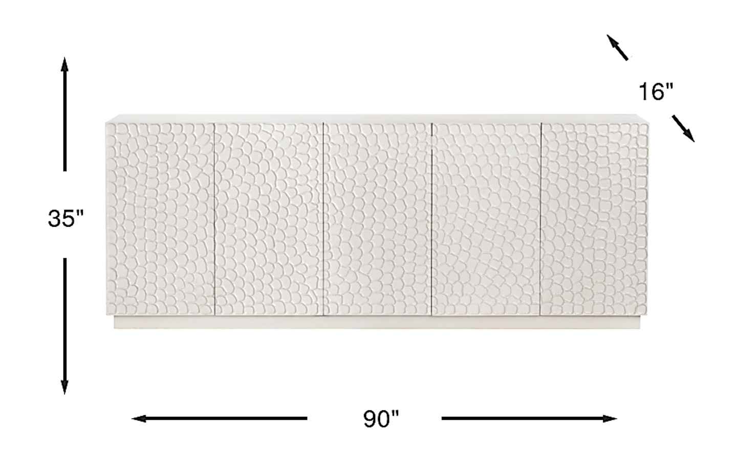 Where beauty meets function in every thoughtful detail, the Celestia credenza brings serene coastal charm and timeless elegance to your favorite living spaces. 90 inches in width, this piece showcases a hand-applied painted white finish that radiates a relaxed yet refined feel. Five paneled doors open to reveal adjustable hidden shelving, giving you the freedom to tuck away electronics, media and more entertaining essentials behind a timeless façade. With integrated wire management and leveled support, the credenza is as practical as it is beautiful.