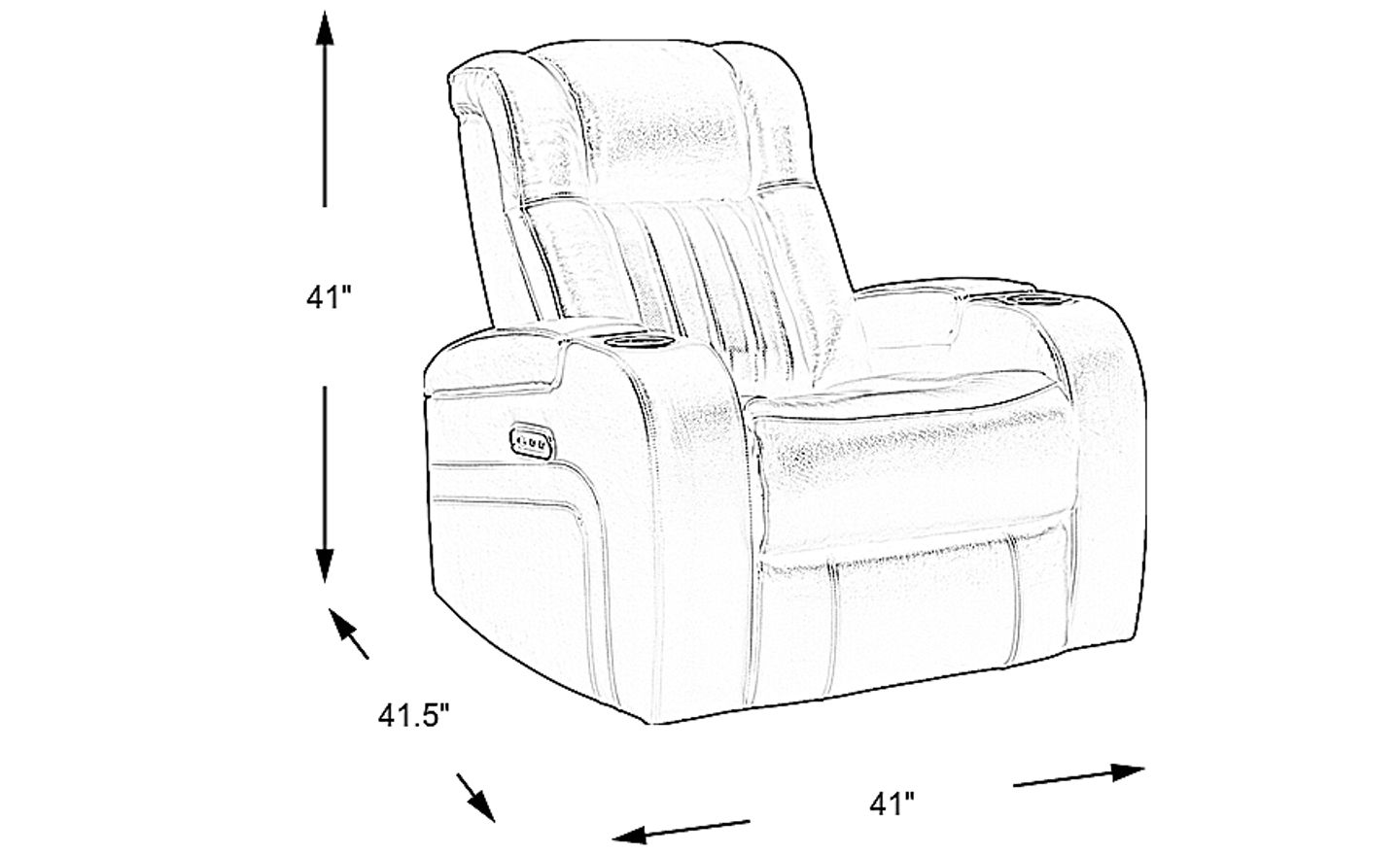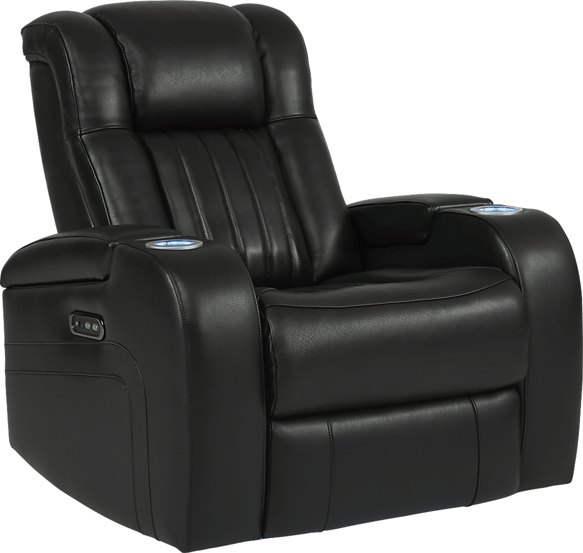 Add comfort at the touch of a button to your living room with the Cenova dual power recliner. With full control over your head and footrest at the push of a button, the dual power reclining feature is the pinnacle of comfort. Upholstered in black, top grain leather where the body touches, this chair offers luxurious seating for your relaxation. Lighted cupholders and hidden storage compartments in the arms of this chair keep everything you need close at hand. 24" extension when footrest is fully reclined. Allow 5" for wall spacing. Upholstery: Top grain leather where the body touches and vinyl sides and backs.