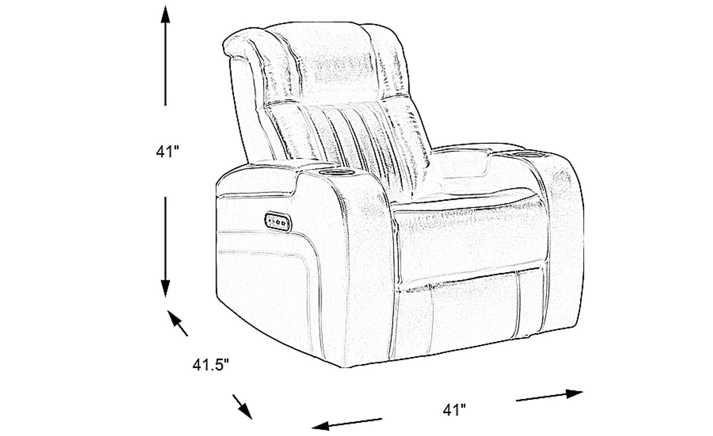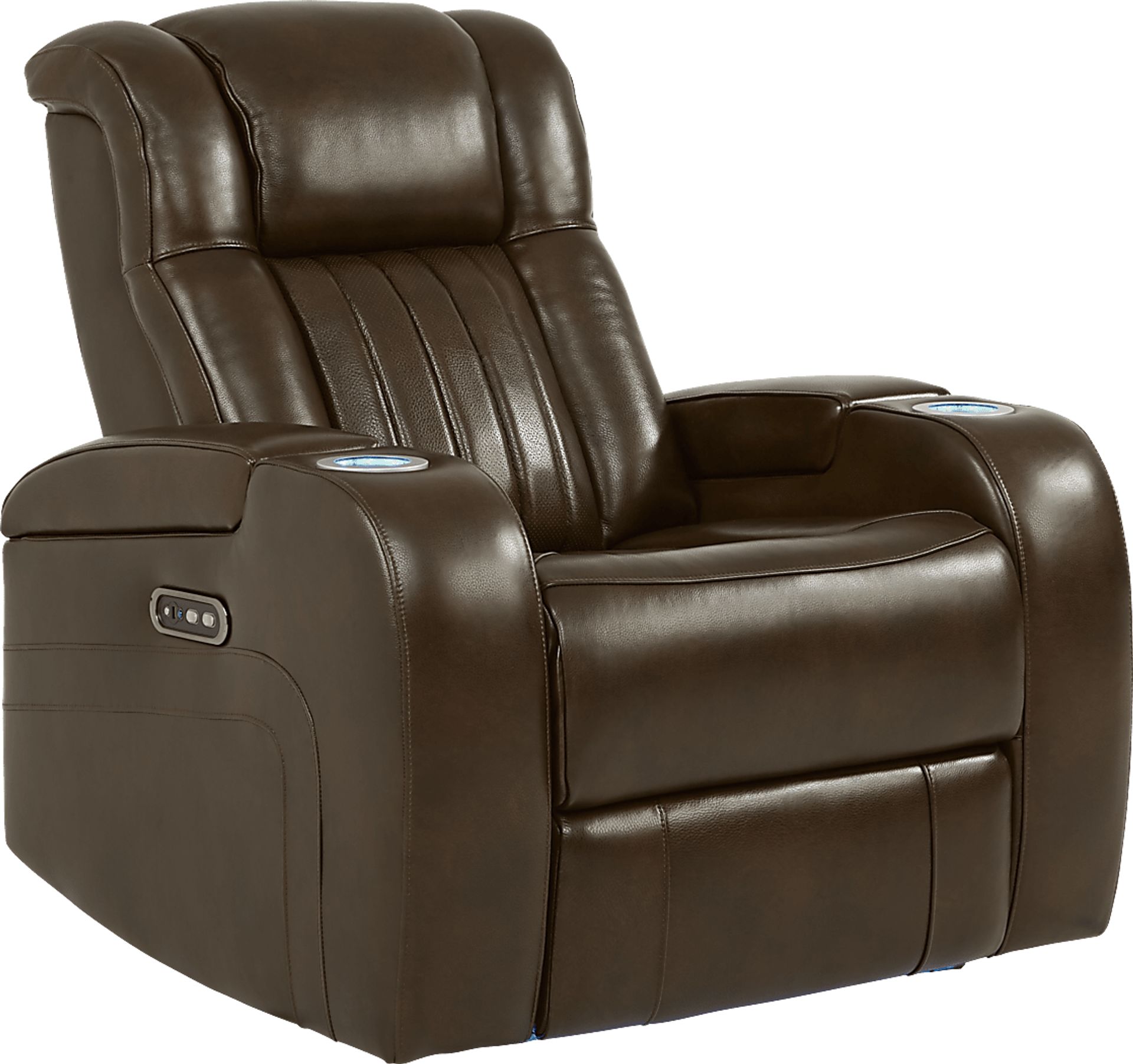 Add comfort at the touch of a button to your living room with the Cenova dual power recliner. Upholstered in brown, top grain leather where the body touches, this chair offers luxurious seating for your relaxation. Lighted cupholders and hidden storage compartments in the arms of this chair keep everything you need close at hand. 24" extension when footrest is fully reclined. Allow 5" for wall spacing. Upholstery: Top grain leather where the body touches and vinyl sides and backs.
