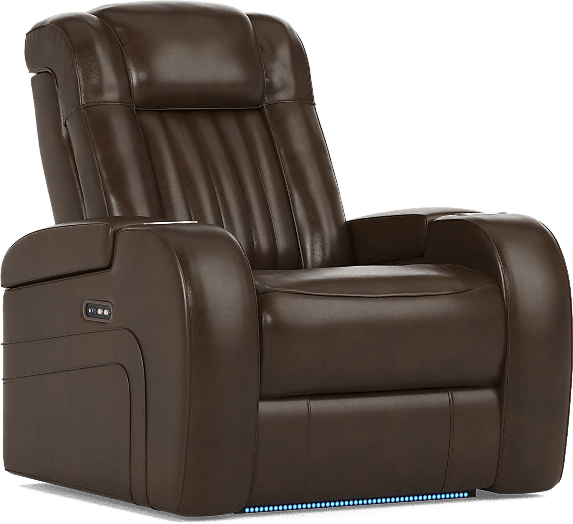 Add comfort at the touch of a button to your living room with the Cenova dual power recliner. With full control over your head and footrest at the push of a button, the dual power reclining feature is the pinnacle of comfort. Upholstered in brown, top grain leather where the body touches, this chair offers luxurious seating for your relaxation. Lighted cupholders and hidden storage compartments in the arms of this chair keep everything you need close at hand. 24" extension when footrest is fully reclined. Allow 5" for wall spacing. Upholstery: Top grain leather where the body touches and vinyl sides and backs.