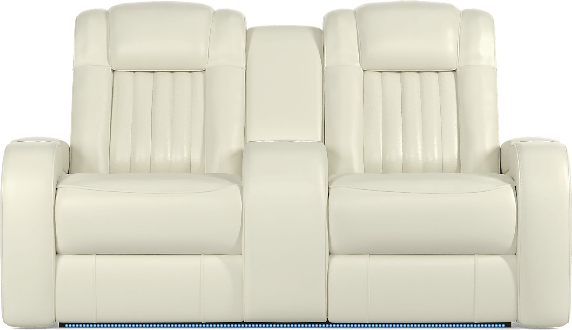 Elegant comfort is available at the touch of a button with the Cenova reclining loveseat. Featuring cupholders and hidden storage built into the arms, this loveseat is cozy with practical flair. The middle console opens for added storage perfect for remotes or magazines. Dual power reclining allows you to control the head and footrest at the push of a button while top grain leather where the body touches in an ivory color keeps you comfortable in any position you're in. The finishing touch to this piece is blue LED lighting along the front base of this piece while additional lighting in the cupholders help to find your drink while enjoying a movie. 25" extension when footrest is fully reclined. Allow 5" for wall spacing. Upholstery: Top grain leather where the body touches and vinyl sides and backs.