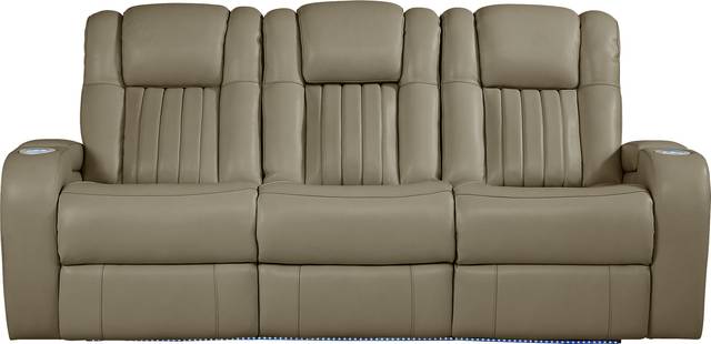 The Cenova dual power recliner is an excellent addition to your living space. Packed with useful features and hidden gems, this sofa is sure to please. In addition to the dual power reclining feature, the middle seat of this sofa folds down to reveal a tray, two cupholders, adjustable reading lights and two wireless charging pads capable of charging compatible devices. Blue LED lighting along the bottom of the piece adds a cool movie theater vibe to your living room while the taupe, top grain leather where the body touches ensures that you can relax in maximum comfort. The final treat of this sofa is a lighted cup holder, USB port and hidden flip up storage in each arm so everything you need can be kept close at hand. 24" extension when footrest is fully reclined. Allow 5" for wall spacing. Upholstery: Top grain leather where the body touches and vinyl sides and backs.