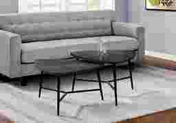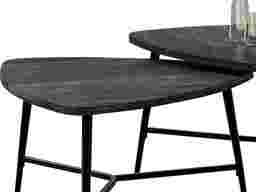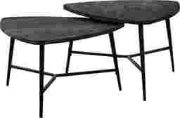Give an easy upgrade to a room with this Cevallos set of two chic nesting coffee tables in a mid-century inspired design. The triangle shaped tops have a smooth black reclaimed wood look laminate finish, complimented with tapered, black metal tripod shaped legs for a contemporary industrial style. Both tables have the same surface size at different heights, designed to neatly stack one under the other as a practical space saving solution or for a creative effect. Move them around when you need extra space for entertaining or keep them nested neatly in place. This table set adds style whether it is placed in a formal living room, family room, or office space. Large table: 32.5"L x 31.5"W x 20"H, small table: 32.5"L x 31.5"W x 18"H. Customer assembly is required.