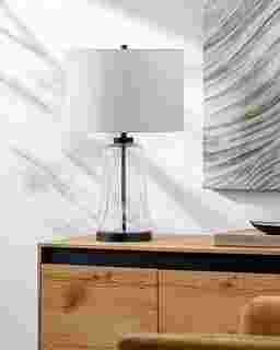 Relax into the flow with the Chaly lamp's gorgeous glass curves lending a little structure and lightening your space. Transparent glass in alternating convex and concave shapes creates a rectangular body on a black iron base, holding a crisp white cotton lampshade. Requires a maximum 60-Watt bulb (not included).