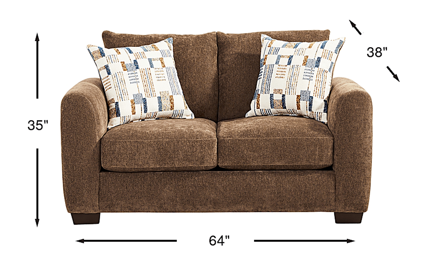 Embracing every moment with cloud-like comfort, the Chamberlain collection's smooth lines and soft texture bring modern ease and quiet calm. Wrapped in plush chocolate brown chenille, this contemporary loveseat offers generously padded cushions and gently rounded track arms that create a pillowy silhouette that balances comfort and style. Two patterned accent pillows bring depth and dimension, while square block legs in a dark brown finish ground the piece with effortless refinement. Upholstery: 100% polyester.