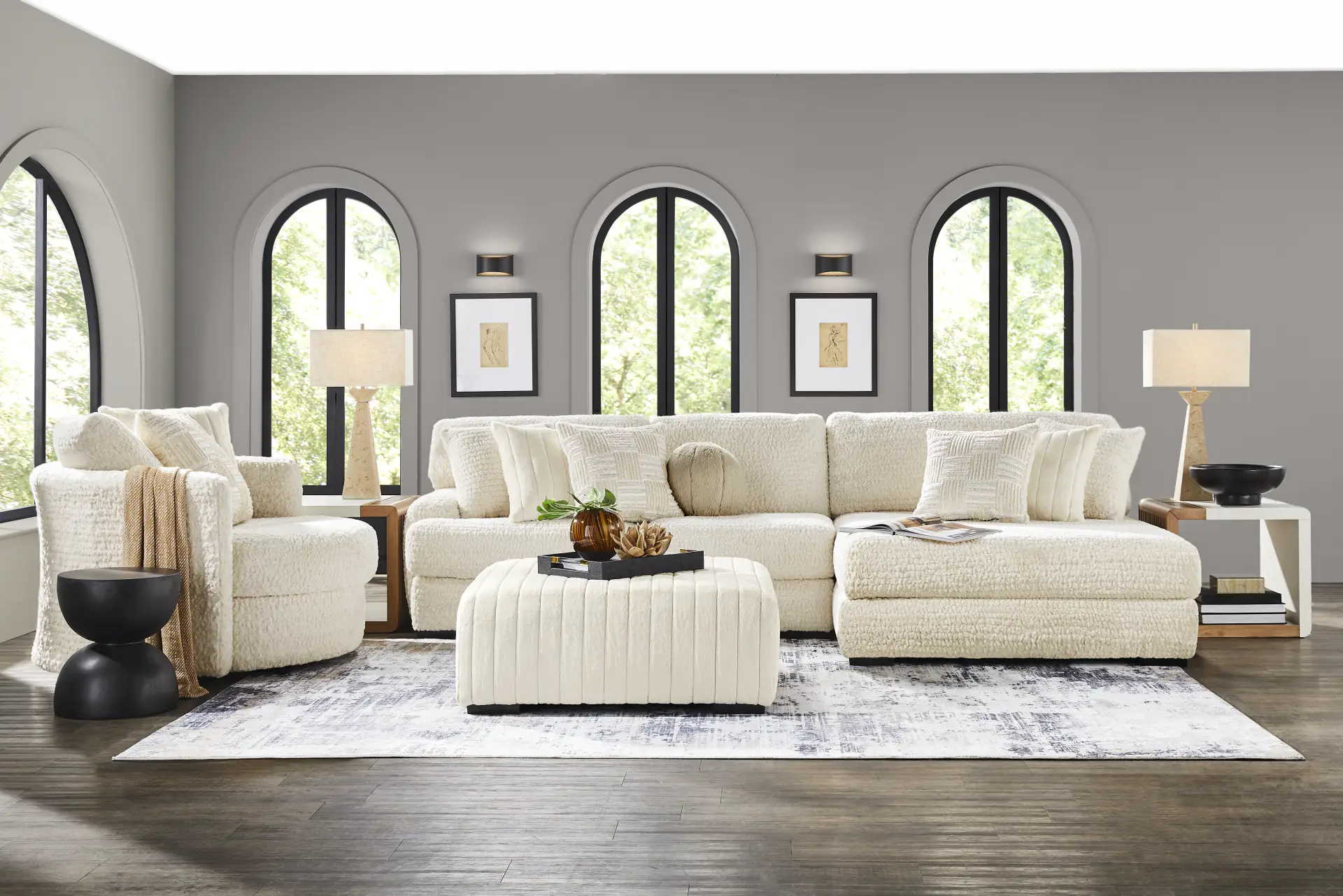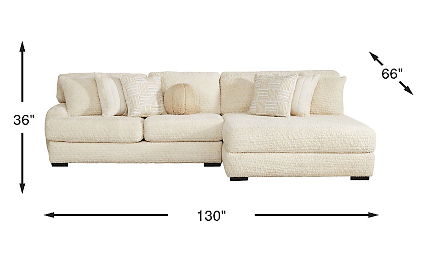 To immerse yourself in the luxury of the Chandler sectional is to fully embrace the softness and comfort of everyday tranquility. Ivory chenille woven into horizontal ridges covers every inch in rich texture, the low-profile arms inviting you to ease into total relaxation. Wide seat cushions and backs ensure space for everyone, while the extra wide chaise offers abundant room to stretch out. Upholstery: 100% polyester.
