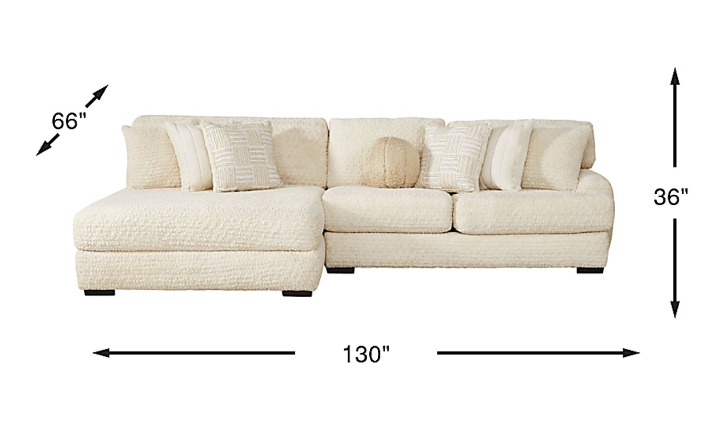 To immerse yourself in the luxury of the Chandler sectional is to fully embrace the softness and comfort of everyday tranquility. Ivory chenille woven into horizontal ridges covers every inch in rich texture, the low-profile arms inviting you to ease into total relaxation. Wide seat cushions and backs ensure space for everyone, while the extra wide chaise offers abundant room to stretch out. Upholstery: 100% polyester.