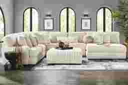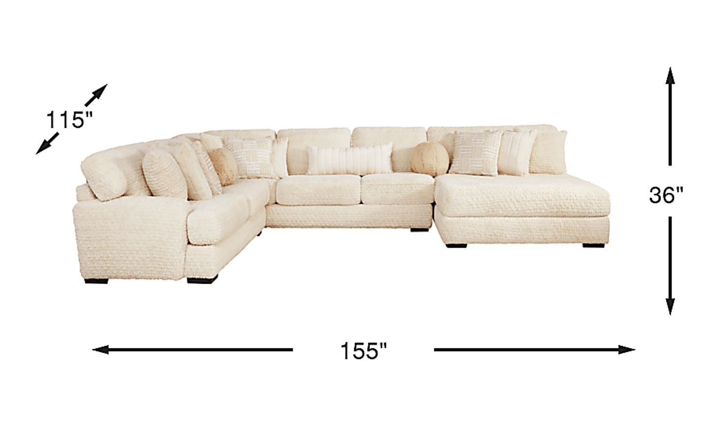 To immerse yourself in the luxury of the Chandler sectional is to fully embrace the softness and comfort of everyday tranquility. Ivory chenille woven into horizontal ridges covers every inch in rich texture, the low-profile arms inviting you to ease into total relaxation. Wide seat cushions and backs ensure space for everyone, while the extra wide chaise offers abundant room to stretch out. Upholstery: 100% Polyester.