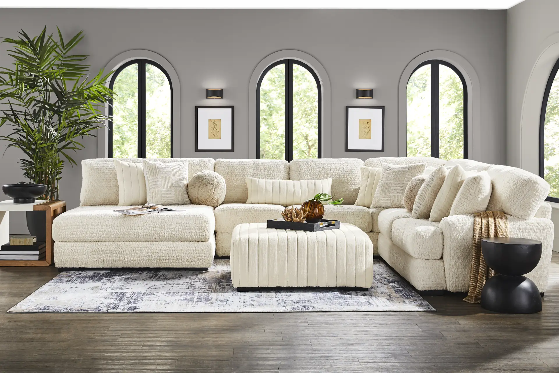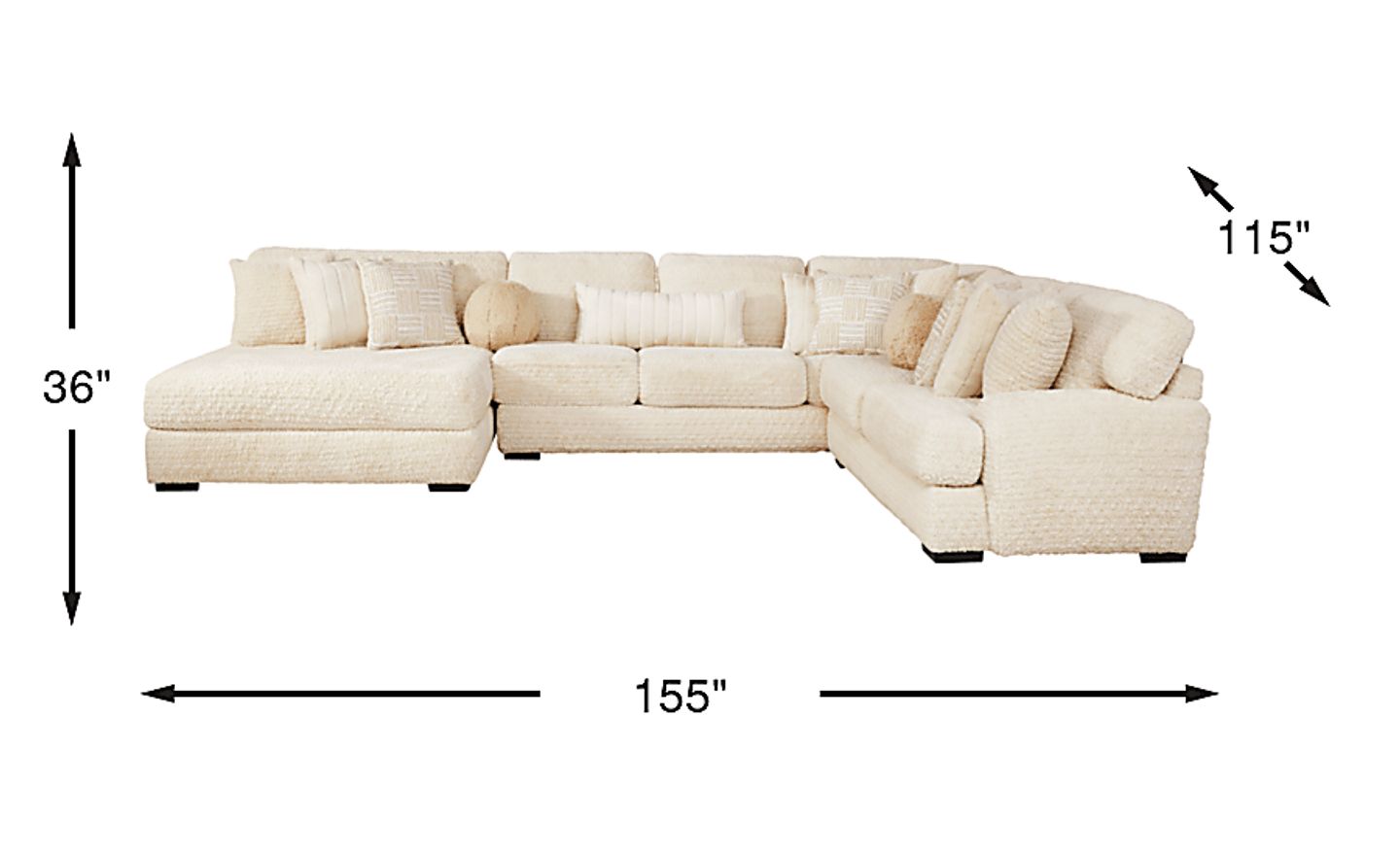 To immerse yourself in the luxury of the Chandler sectional is to fully embrace the softness and comfort of everyday tranquility. Ivory chenille woven into horizontal ridges covers every inch in rich texture, the low-profile arms inviting you to ease into total relaxation. Wide seat cushions and backs ensure space for everyone, while the extra wide chaise offers abundant room to stretch out. Upholstery: 100% Polyester.