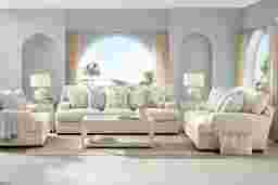The calming hush of a coastal breeze. The quiet murmur of tall grass in a gentle wind. The cozy embrace of home. They all come together in the Channel Park collection from Cindy Crawford Home, where soft details and graceful curves invite moments of tranquility. Featuring sophisticated track arms and loose, pillowy back and seat cushions upholstered in light beige boucle, this transitional living room makes everyday relaxation feel like a serene, cloud-like escape. Seat cushions feature a plush custom blend of feathers, fiber and down surrounding a supportive foam core for comfort that’s soft yet structured. Coordinating accent pillows complete the richly textured look, while block legs in an espresso finish add a final touch of subtle elegance. Upholstery: 99% Polyester, 1% Acrylic. Cleaning Instructions: Use water based cleaning agents or foam. Tables and lamps not as shown in room image.