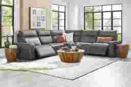Discover the unlimited possibilities of the dual power reclining ModularTwo, thoughtfully designed with both comfort and flexibility in mind. Contemporary in style and upholstered in a plush suede-soft charcoal colored microfiber, its tailored silhouette is enhanced by welted track arms and tufted back cushions for a look of refined elegance and serenity. Each piece is upholstered on all sides, offering endless opportunities for both reconfiguration as well as individual use. Dual power reclining functionality allows for easy adjustment in the headrest and footrest, providing the ultimate in personalized comfort. Select a preconfigured design or visit a showroom to learn about individual components and create the modular solution perfect for your space and style. Upholstery: 100% Polyester