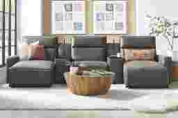 Discover the unlimited possibilities of the dual power reclining ModularTwo, thoughtfully designed with both comfort and flexibility in mind. Contemporary in style and upholstered in a plush suede-soft charcoal colored microfiber, its tailored silhouette is enhanced by welted track arms and tufted back cushions for a look of refined elegance and serenity. Each piece is upholstered on all sides, offering endless opportunities for both reconfiguration as well as individual use. Dual power reclining functionality allows for easy adjustment in the headrest and back, providing the ultimate in personalized comfort. The two consoles include touch-activated reading lights and swivel-top wood tables with hidden storage for easy access to your lounging essentials. Select a preconfigured design or visit a showroom to learn about individual components and create the modular solution perfect for your space and style. Upholstery: 100% Polyester