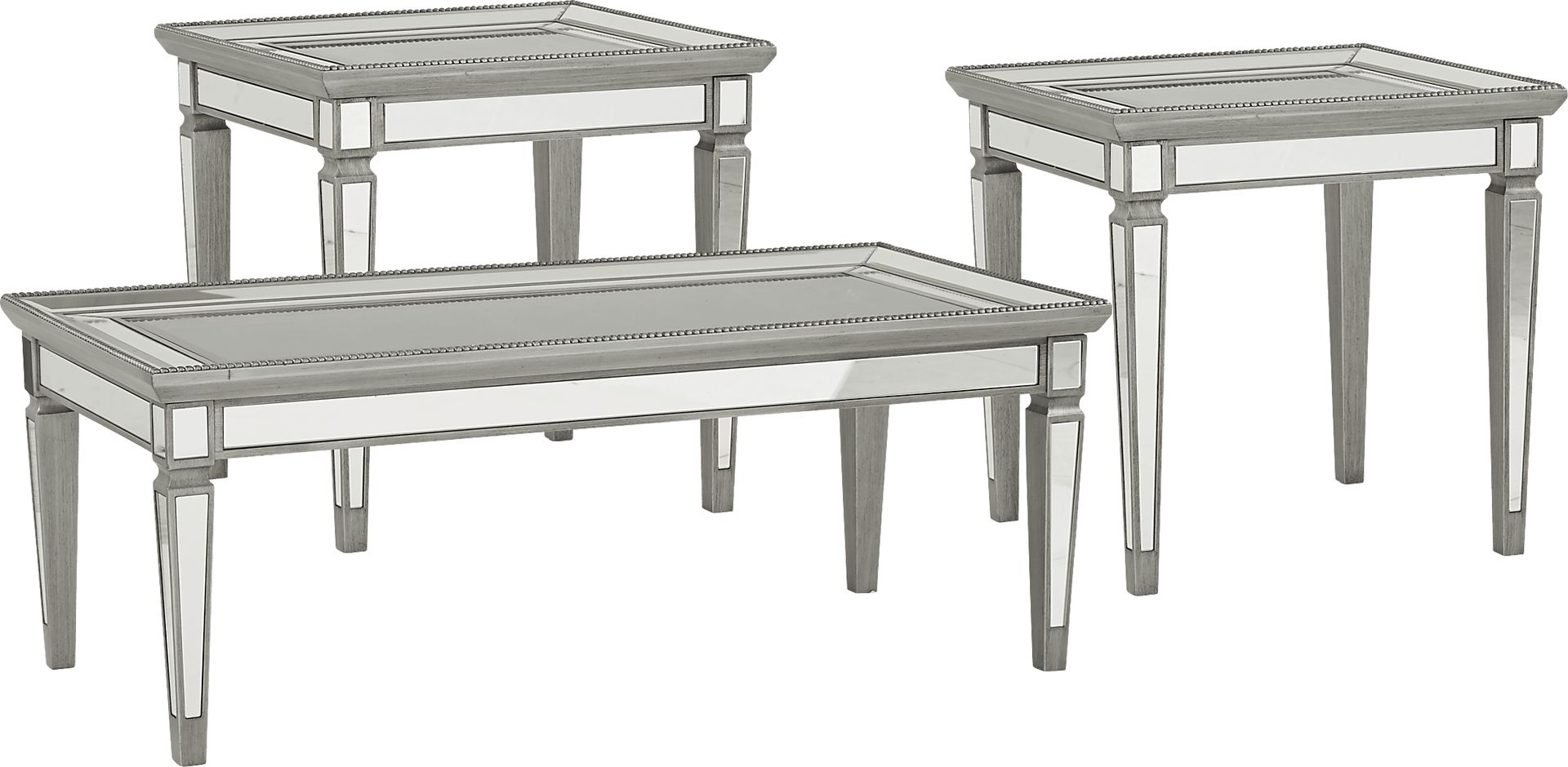 Bring glamour to your living space with the Charlaine table set. Each piece, including a cocktail table and two end tables, boasts mirrored detailing and a beautiful silver finish. Glass tops framed with double mirrored borders have beaded trim for a sophisticated touch.