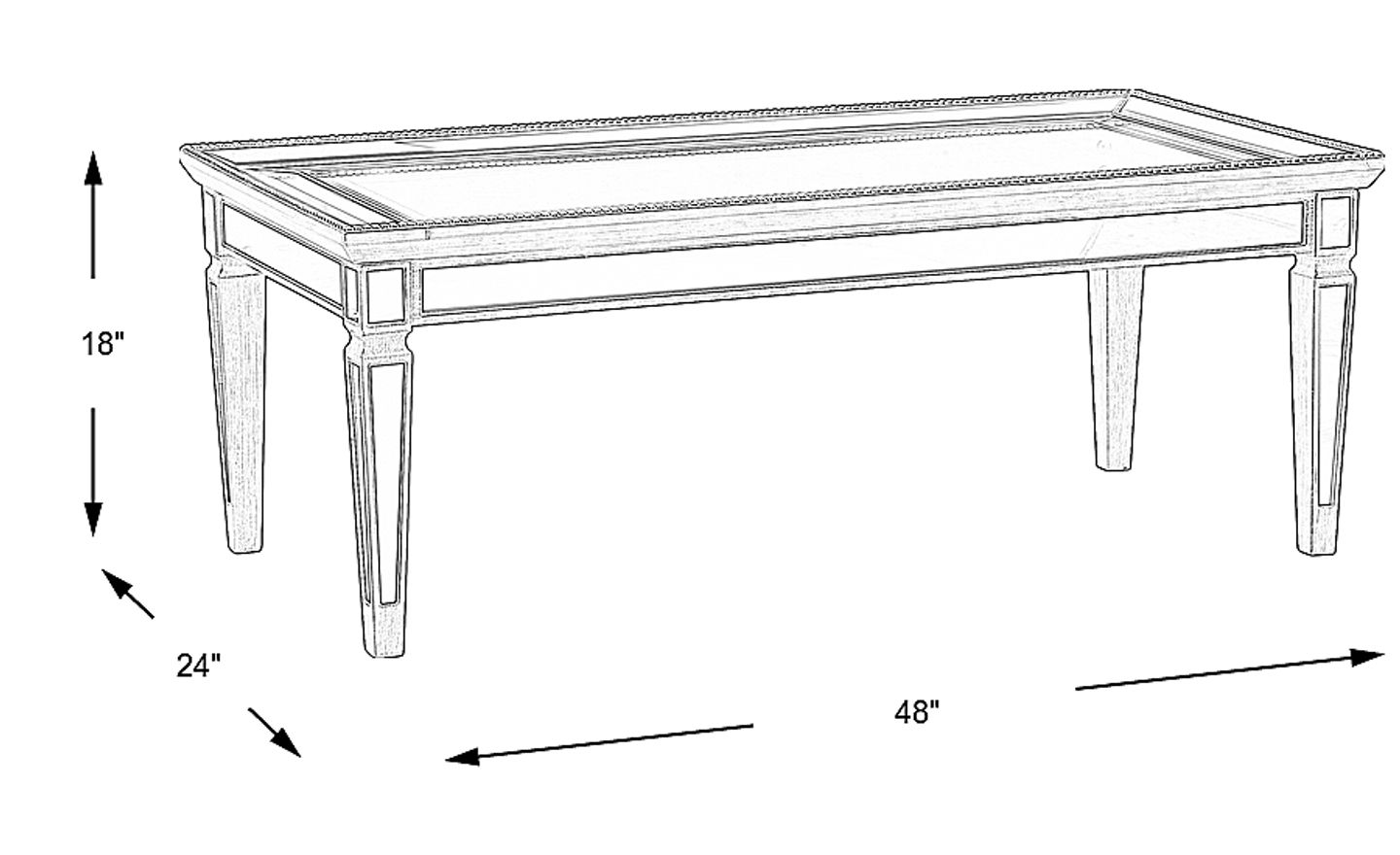 Glamour and sophistication meet on the Charlaine cocktail table. This elegant, contemporary piece features a sliver finish and mirrored inserts. The glass top is framed with two mirrored borders. The outer edge of the top boasts elegant beaded trim.