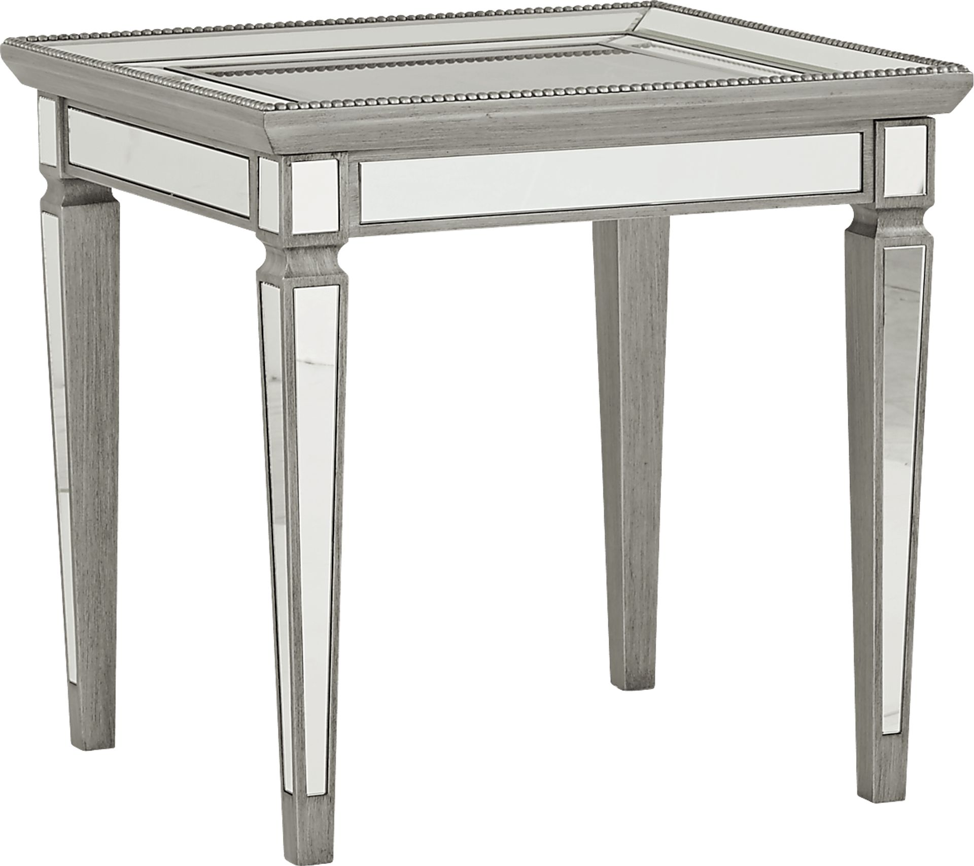 A sophisticated complement to almost any sofa, loveseat or chair, the Charlaine end table is a distinctive choice. It boasts mirrored detailing and a beautiful silver finish. The glass top is framed with two mirrored borders. The outer edge of the top has elegant beaded trim.