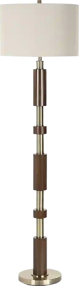The Charlevoix Gate Brown Floor Lamp features a striking design with alternating wooden cylinders and brass plated details that exude a modern feel with Mid-Century elements. The round hardback drum shade is a crisp white linen fabric. Partial assembly may be required.
