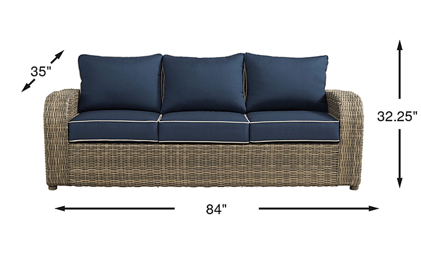 Enhance your outdoor environment with the Charlotte Harbor sofa. This comfortable and durable sofa is crafted with a long-lasting aluminum frame wrapped in a beautiful two-tone gray synthetic vinyl wicker. Cozy back and seat cushions are covered with navy Sunbrella performance fabric covered cushions. This fabric, ideal for outdoor use, is colorfast, mold and mildew resistant.