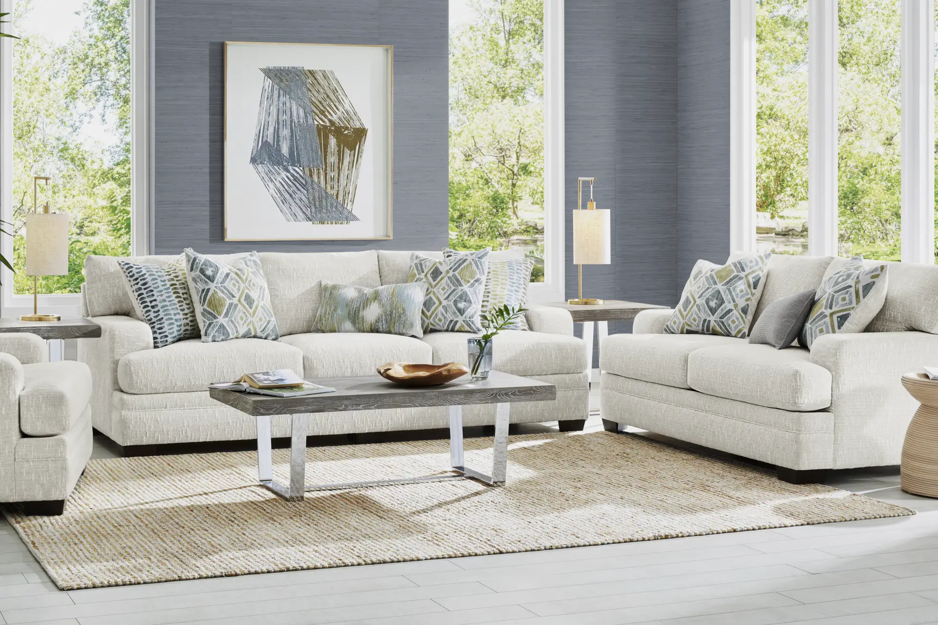 Comforting spirit, assertive flair and a glint of playfulness in the Charlton Park living room enliven the everyday with an irresistibly unique sense of possibility. The ivory chenille upholstery in this contemporary collection is streaked through with raised yarns, adding visual and physical texture. Extra wide track arms invite you to ease into sumptuous reversible back cushions on a wedge-shaped back. T-cushion seats are accented by the stitched border that wraps around the front of the base. Adding a touch of contrast, the look is completed with triangle legs in a dark finish. Upholstery: 100% Polyester. Cleaning Instructions: Use water-based cleaning agents or foam. Tables and lamps not as shown in room image.