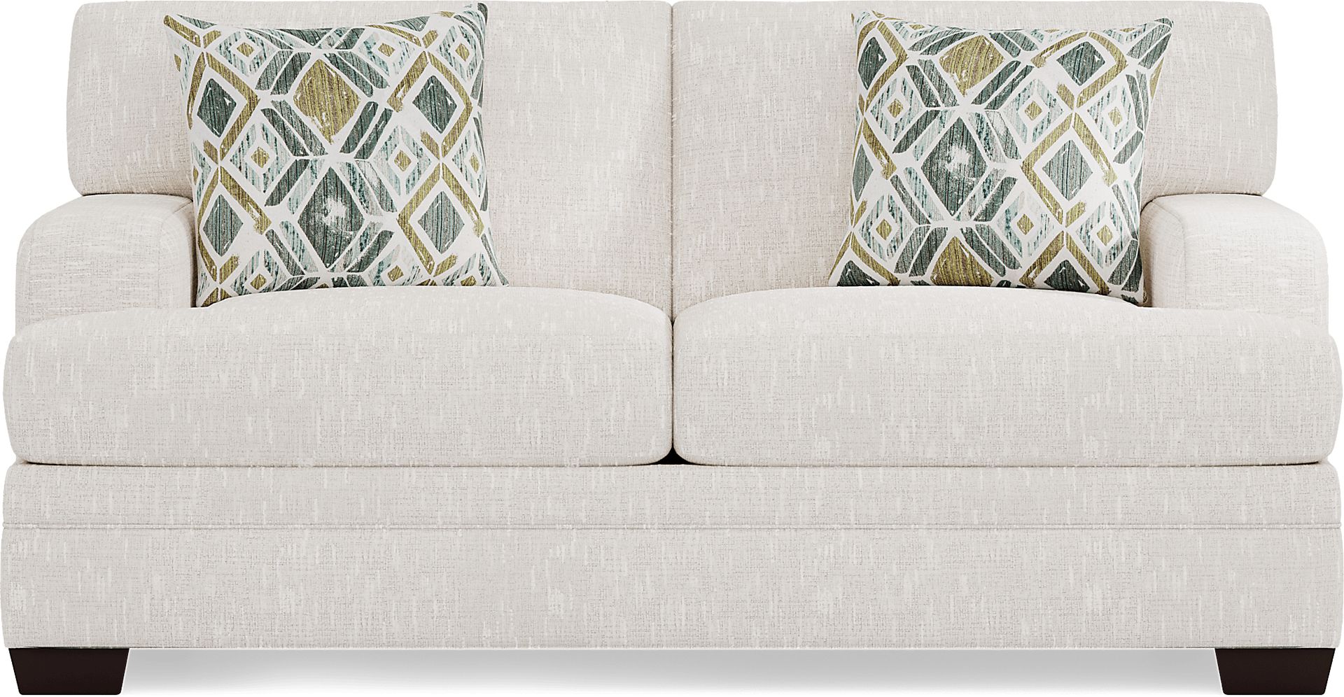 Comforting spirit, assertive flair and a glint of playfulness in the Charlton Park loveseat enliven the everyday with an irresistibly unique sense of possibility. The ivory chenille upholstery in this contemporary piece is streaked through with raised yarns, adding visual and physical texture. Extra wide track arms invite you to ease into sumptuous reversible back cushions on a wedge-shaped back. T-cushion seats are accented by the stitched border that wraps around the front of the base. Adding a touch of contrast, the look is completed with triangle legs in a dark finish. Upholstery: 100% polyester.