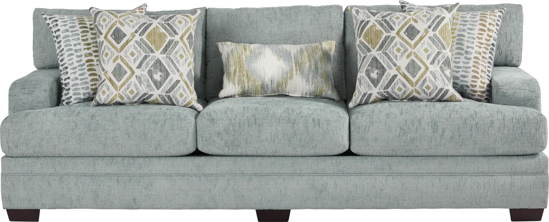 Comforting spirit, assertive flair and a glint of playfulness in the Charlton Park sofa enliven the everyday with an irresistibly unique sense of possibility. The mist-colored blue chenille upholstery in this contemporary piece is streaked through with raised yarns, adding visual and physical texture. Extra wide track arms invite you to ease into sumptuous reversible back cushions on a wedge-shaped back. T-cushion seats are accented by the stitched border that wraps around the front of the base. Adding a touch of contrast, the look is completed with triangle legs in a dark finish. Upholstery: 100% polyester.