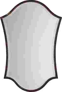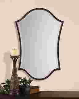 This shapely, beveled Charlyn mirror features a narrow frame finished in lightly distressed bronze with burnished details. Mirror has a generous 1 1/4 bevel.