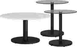 This set is scaled to complement most standard sofas and seating arrangements. The round cocktail table measures 34 inches in width and depth with a low-profile height of 17 inches, ideal for keeping sightlines open. The two matching end tables are 22 inches wide and 22 inches deep, standing at a standard height of 22 inches to sit flush with most chair or sofa arms for easy access to drinks or lamps.