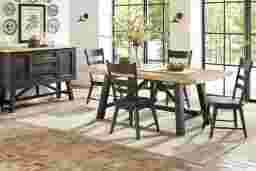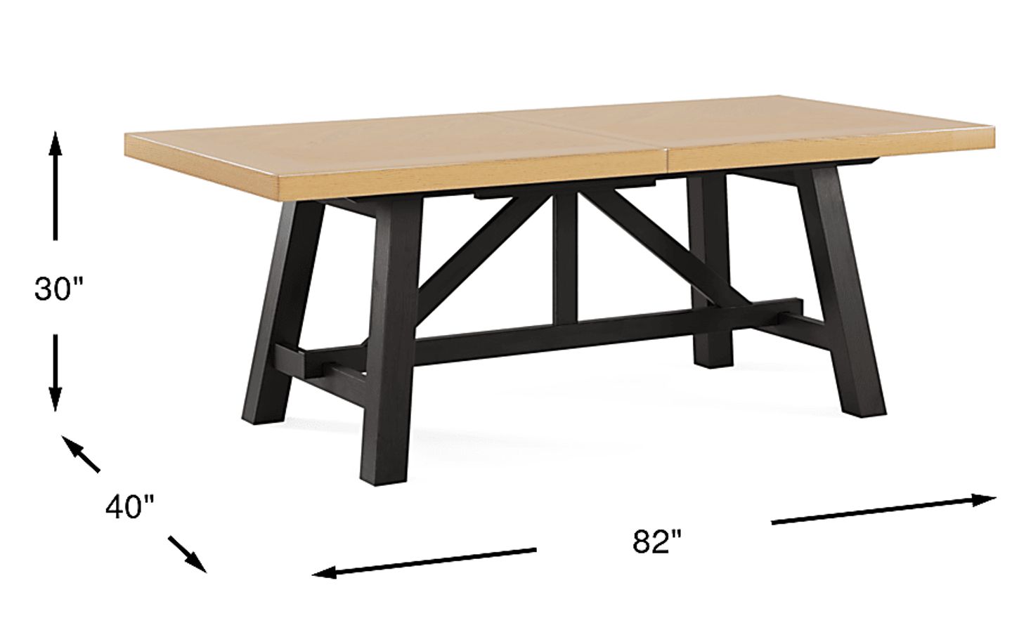 Quiet, intimate dinners by candlelight give way with casual ease to popping corks and gatherings of lively revelers with the Chastain Park collection's dynamic design and charming details. This modern dining table features a chevron top in a natural finish and a rich black trestle base for a striking contrast. Designed for versatility, the tabletop extends from 82 to 102 inches, making it perfect for small or large meals.