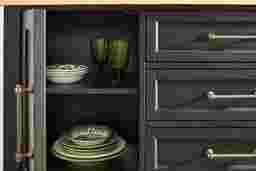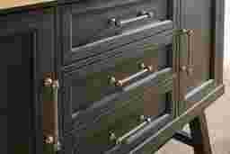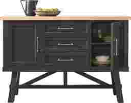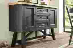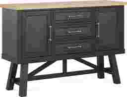 Quiet, intimate dinners by candlelight give way with casual ease to popping corks and gatherings of lively revelers with the Chastain Park collection's dynamic design and charming details. This modern server comes in a rich black finish and features a chevron top in a natural finish for a striking contrast. Designed for versatile storage, two cabinets and three drawers make it easy to organize all your dining essentials. An outlet with USB ports provides a convenient power source that's great for kitchen appliances or decorative accents like a stylish lamp.