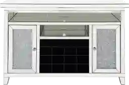 The Chatsworth wine cabinet is accented with mirroring and faux diamonds. Complete with two doors for storage and one open compartment. Customer assembly is required.