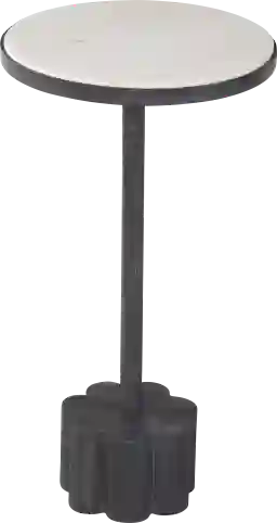 The Chavenson black accent table features a white marble top with a black iron metal frame and scalloped base design.