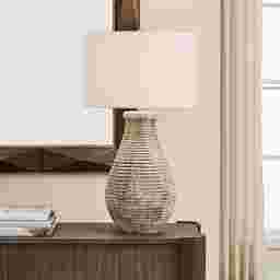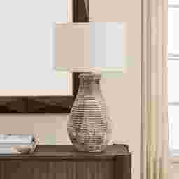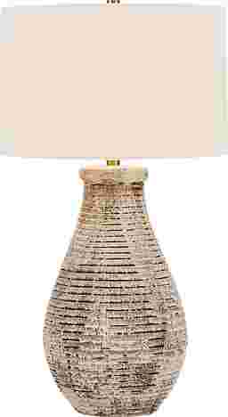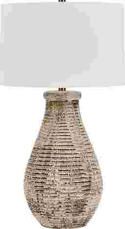The Cherro Gray Lamp feels like a piece unearthed from an ancient seaside villa-its sculpted, ribbed base carrying the soft patina of time, texture, and craftsmanship. The weathered stone-like finish brings a sense of warmth and grounded beauty, while its graceful silhouette adds an inviting, organic softness to any room. Paired with a creamy, understated shade, it casts a gentle glow that feels like dusk settling over a calm landscape. Let this effortlessly earthy, soulfully textured lamp be the one you bring into your home. Partial assembly may be required.