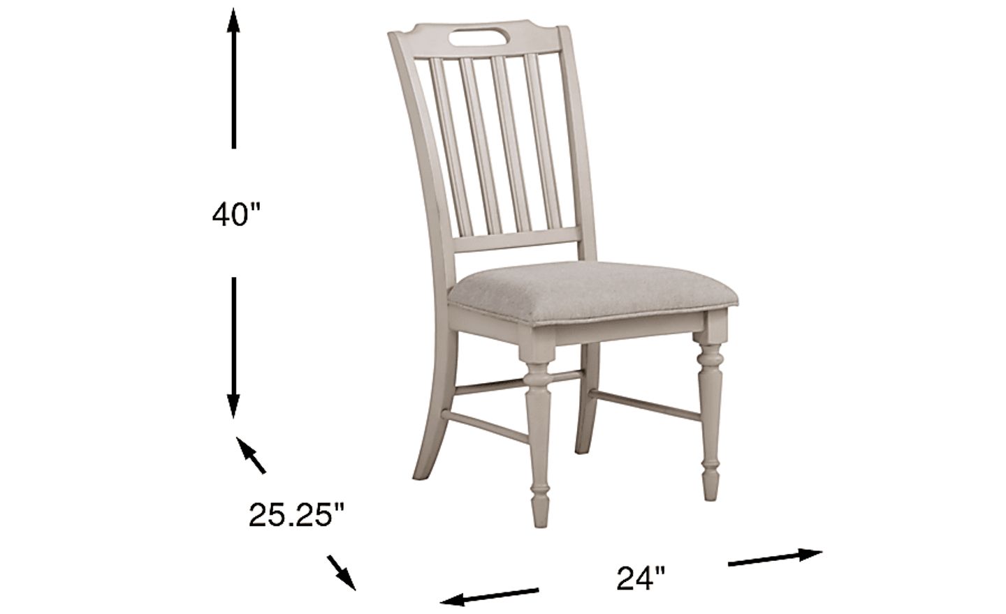 Timeless style including a slat back and turned front legs make the Chestnut Ridge side chair a charming choice for dining room seating. Made with wood solids, the chair has bisque finish and comfortable padded upholstered seat.